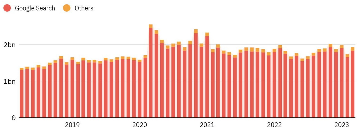 Поиск был главным источником трафика на протяжении пяти лет. Исключением стал 2019 года, когда соцсети привели на новостные сайты больше читателей. Среди поисковиков, естественно, доминирует Google, на его долю приходится 95% переходов. Другие поисковые системы, например, Bing или Yahoo, делят оставшиеся 5%.