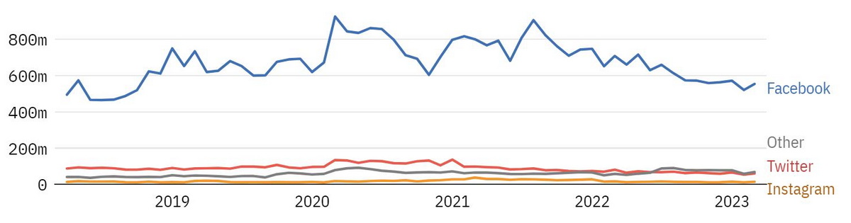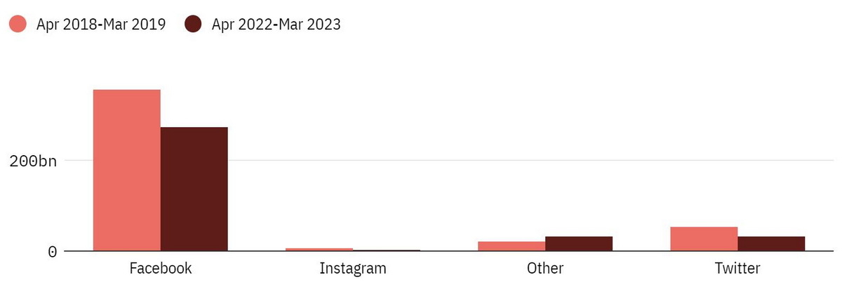 За пять лет количество реферальных переходов из Facebook на сайты новостных медиа в основном было стабильным. Исключением стали 2020-й и 2021 годы, когда находящиеся в карантине читатели проводили много времени в соцсетях, главным образом в Facebook. Если говорить о более конкретных цифрах, то с апреля 2018 года по апрель 2019 года пришедшие из Facebook* читатели просмотрели 6,8 млрд страниц, а в тот же период в 2022-2023 гг. – 7,2 млрд. В последнее время этот показатель снижается.
