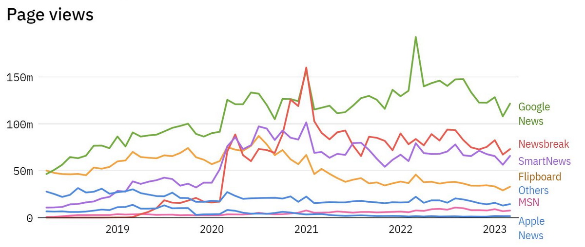 Google News генерирует наибольшее количество просмотров страниц, за ним следует местный новостной агрегатор News Break из США. Apple News, хотя и является одним из наиболее часто используемых новостных приложений, сгенерировал мало просмотров страниц, поскольку он не настроен для перенаправления трафика обратно на сайты издателей.