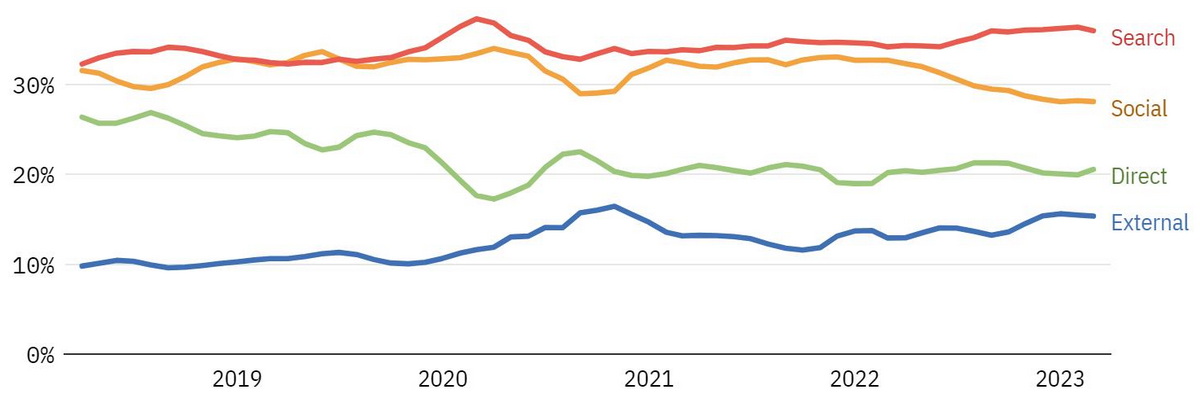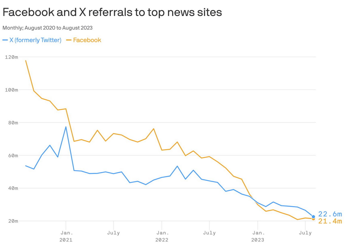 Гораздо менее мрачную картину рисует портал Press Gazette, специализирующийся на проблемах новостных медиа. Издание проанализировало трафик 546 новостных сайтов Великобритании и США с 2018 по 2023 год и пришло к выводу, что значение соцсетей как канала для привлечения читателей действительно снизилось, но не так критично. Количество посетителей из соцсетей на новостных сайтах с 2018 года сократилось с 32% до 30%. Читательский трафик перетек из соцсетей к поисковикам, которые за тот же период увеличили свою долю на те же 2%, с 33% до 35%.