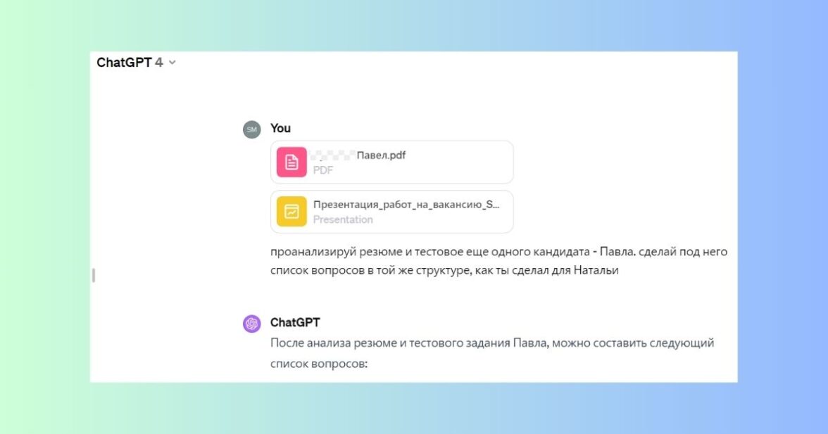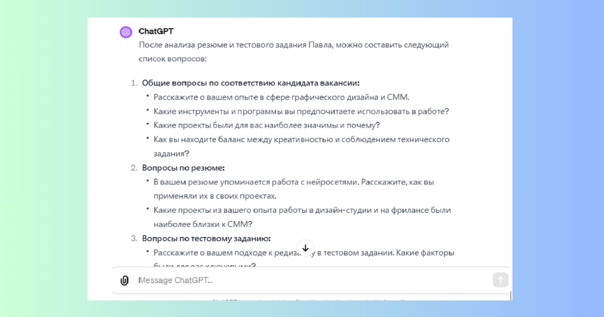 Подготовка к интервью: ChatGPT также играет важную роль в подготовке уникальных вопросов для собеседования с каждым кандидатом. В преддверии встречи, наш интервьюер прогоняет через чат-бот тестовое задание кандидата и его резюме, что позволяет быть уверенным, что каждый аспект будет учтен в списке вопросов к интервью.