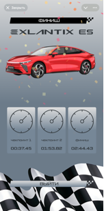 По завершении игры на экране финиша отображается 3D-модель автомобиля, выбранная для заезда.