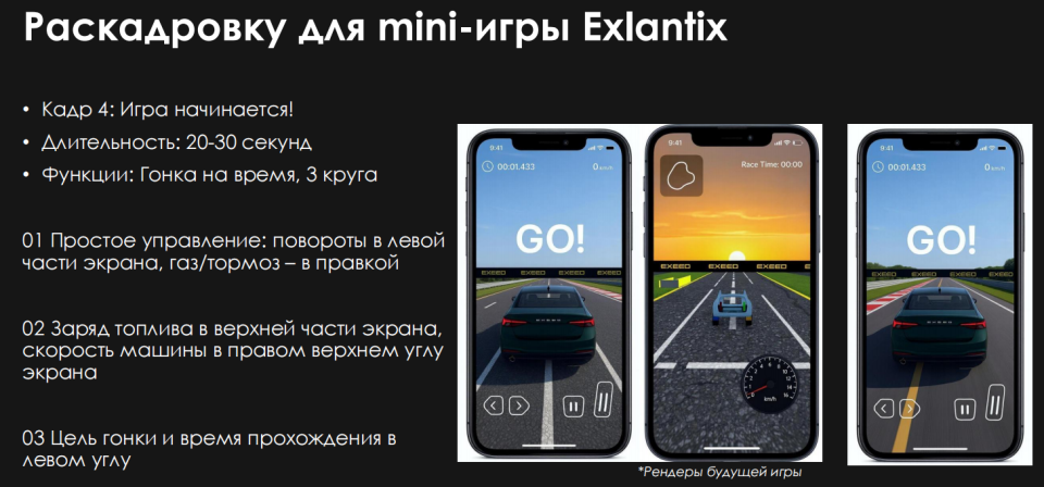 Клиент с воодушевлением отнесся к инициативе, и после мозгового штурма было решено остановиться на mini-app приложении в формате «гонки». Главной целью игры было развлечь пользователей и направить самых заинтересованных на запись тест-драйва моделей EXLANTIX.