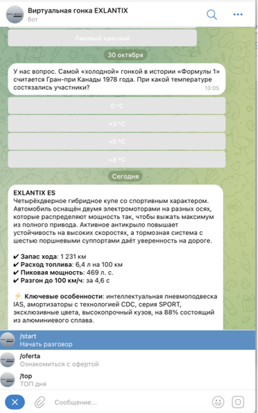 1. Приветствие и начальное сообщение. В него входит краткое описание проекта, правила и условия участия, информация о призах, все прямые ссылки, необходимые пользователю, кнопки, ведущие на официальное предложение (оферту) и на актуальный топ лидеров по скорости заезда. А также подробные характеристики моделей EXLANTIX ET и EXLANTIX ES с кнопкой для записи на тест-драйв.