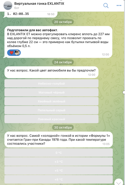 EXLANTIX ET и ES, связанных с темой гонок, 5 опросов о личных интересах и предпочтениях пользователей и 6 опросов-викторин на тему гонок и характеристик модельного ряда EXLANTIX.