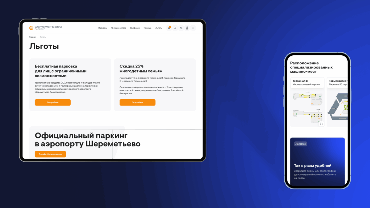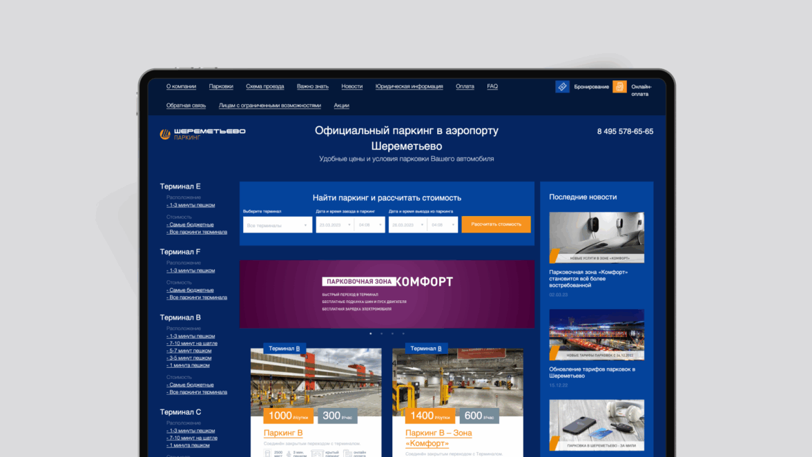 Клиенты заходят на сайт Шереметьево Паркинг, чтобы быстро забронировать парковку или зайти в личный кабинет. Им нужен понятный сервис —, а не сложные анимации и лишние акценты. Этого подхода и придерживались при создании Шереметьево Паркинг.