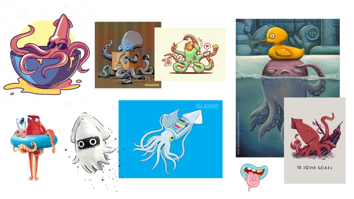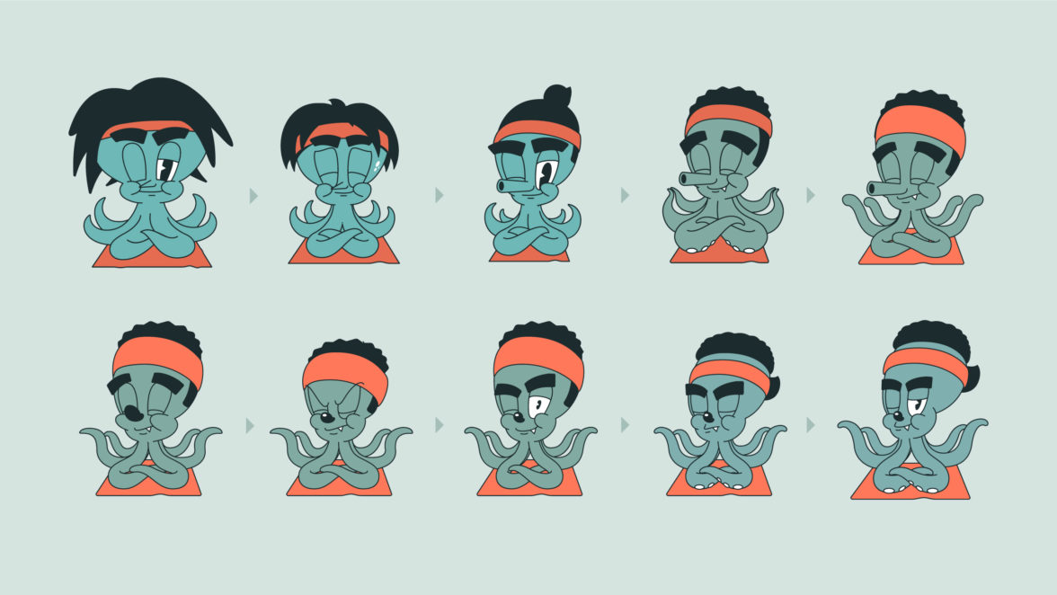 В поиске решения, наиболее оптимального по соотношению времени и результата, мы пришли к… осьминогу. Да, плавные, изгибающиеся объекты делать проще, чем скелетную анимацию. Плюс осьминог прекрасно вписался в концепт: таких героев почти нет в ТГ, он символизирует многозадачность, и появился челлендж, сделать его не так, как мы привыкли видеть в мультфильмах.