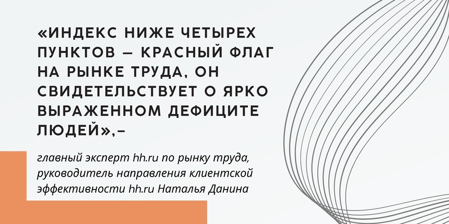 Со второй половины текущего года hh-индекс (отношение среднего числа активных резюме к среднему числу активных вакансий) находится на уровне 3,3–3,4 пункта.