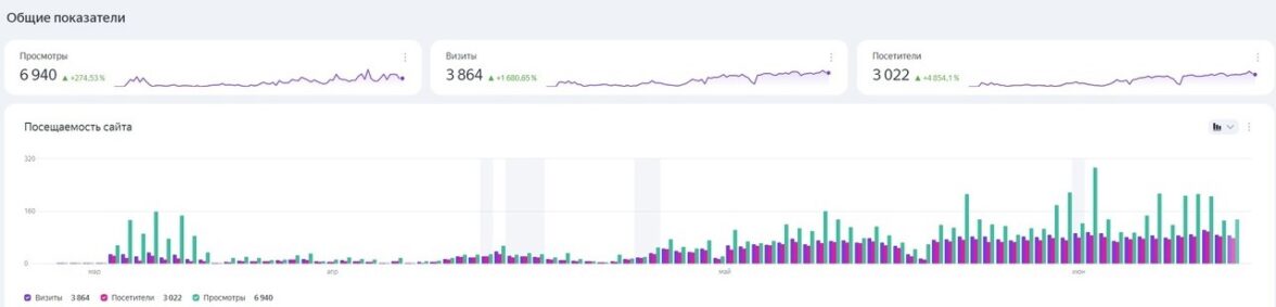 Общее количество просмотров сайта — 6940, количество уникальных посетителей — 3022 человека. Самое высокое количество просмотров сайта в день (за период выборки) — порядка 300.