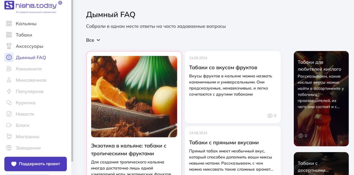 Как видите, особенность информационного портала Shisha.today заключается не только в его контентном наполнении, но и в грамотной организации внутреннего пространства сайта, что обеспечивает пользователям комфортный доступ к необходимой информации и активное взаимодействие внутри площадки и более глубокое погружение.