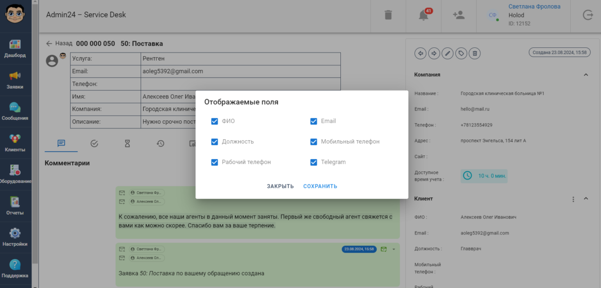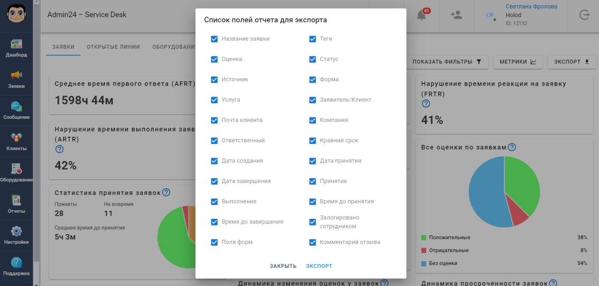 Добавлена возможность выбора полей, которые будут содержаться в отчете по заявкам при экспорте.