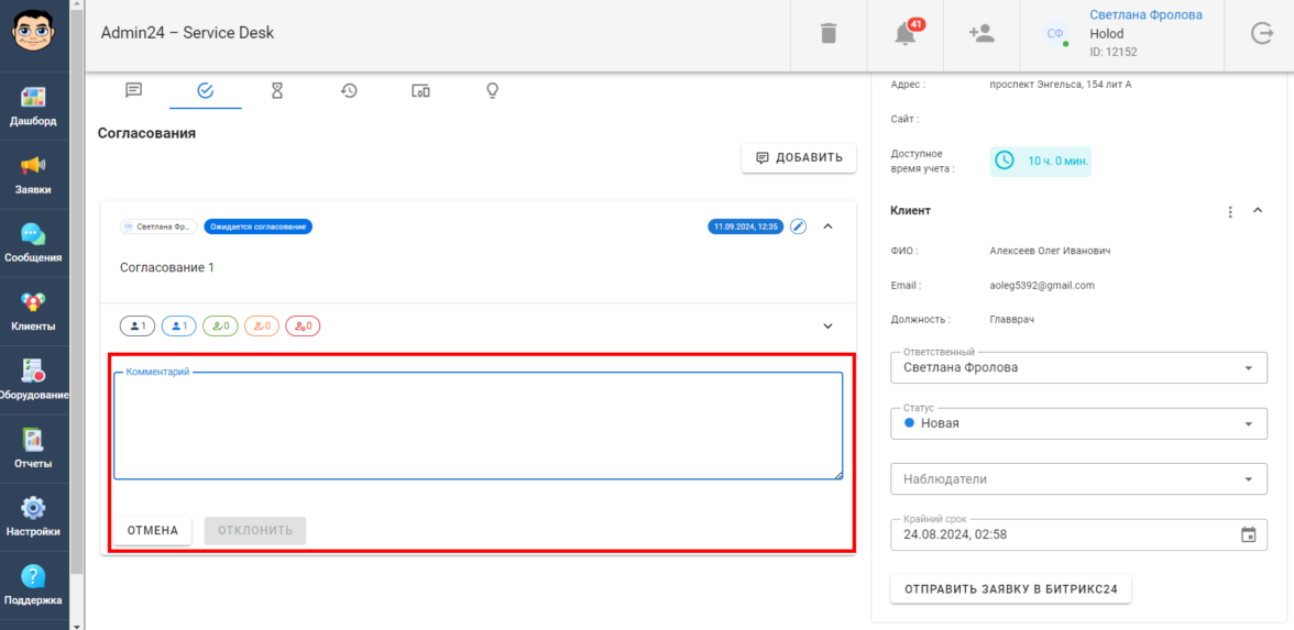 Поле «Комментарий» стало обязательным для заполнения при отклонении согласования.