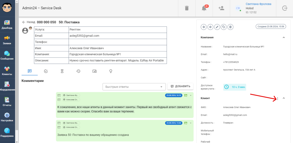 Чтобы изменить отображаемые поля контакта на детальной странице заявки, нужно открыть страницу заявки и кликнуть по многоточию меню напротив контакта: