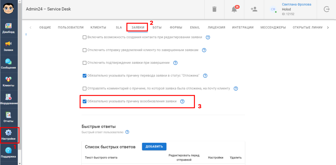 Теперь вы можете включить функционал, при котором, при возобновлении заявки, клиент должен указать причину возобновления. Сделать это можно в разделе «Настройки» на вкладке «Заявки»: