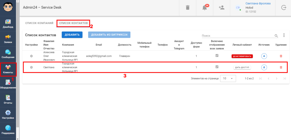 А контакт появится в списке контактов в разделе «Клиенты»: