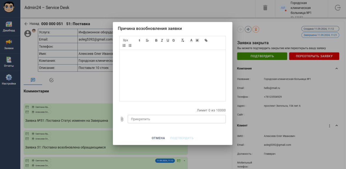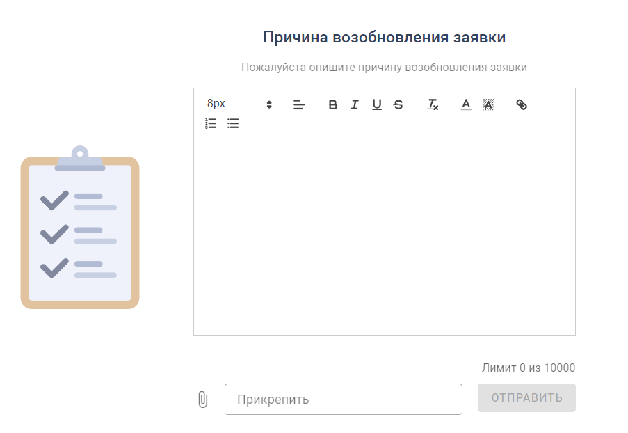 Если функционал включен, при возобновлении заявки клиент должен будет указать причину (до 10 000 символов) в открывшемся окне. К причине возобновления заявки можно прикрепить файл.