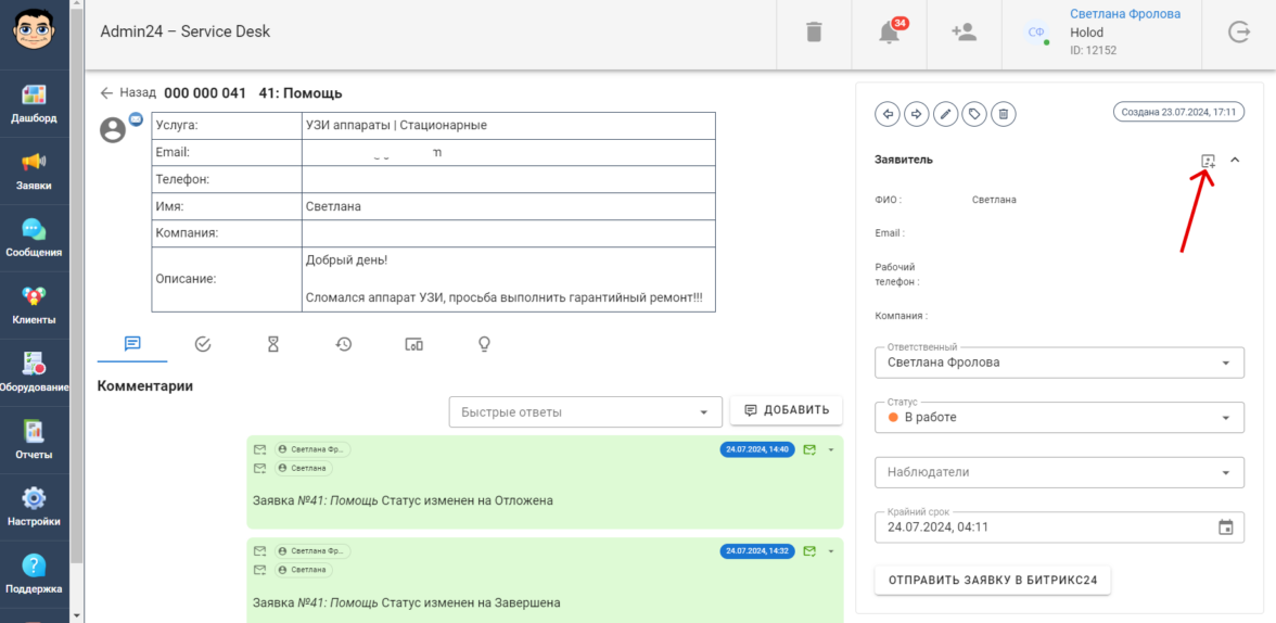 Теперь вы можете создавать контакт прямо на детальной странице заявок, нажав на иконку в виде человека со знаком «+».