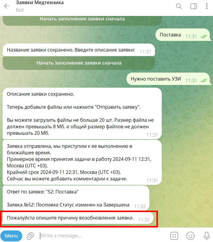 После возобновления заявки причина отобразится в комментариях: