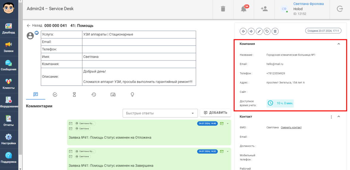 Теперь пользователи с правами «Модератор» могут добавлять учет времени в заявках.