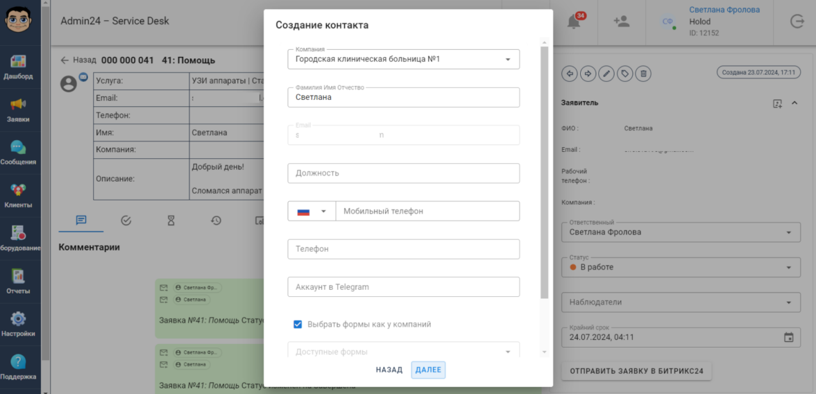 И создать контакт, указав ФИО, контактные данные, должность, и форму. Для создания контакта нужно нажать «Далее».
