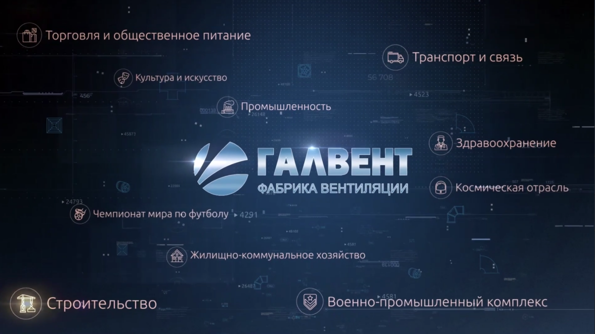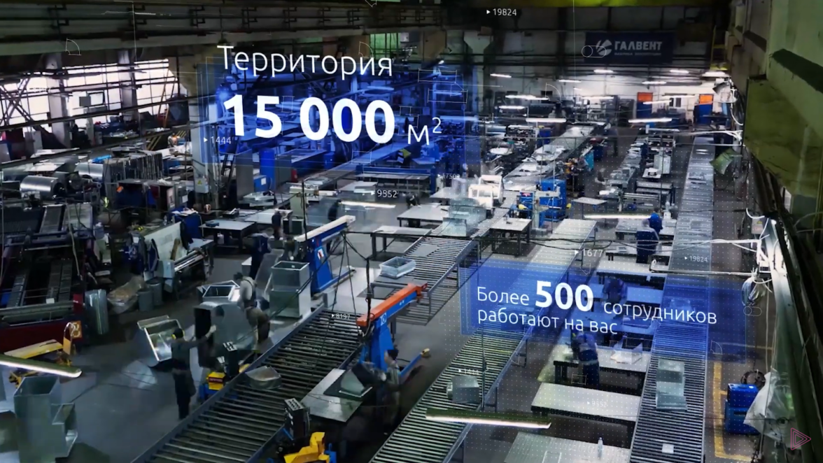 Графическое оформление. На этапе постпродакшн мы разработали эксклюзивное графическое оформление с донесением ключевых фактов о заводе, интегрировали элементы нового логотипа и фирменного стиля, чтобы отразить новый подход «ГалВент» к позиционированию на рынке.