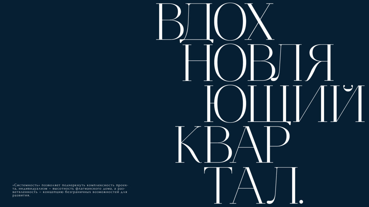 Дескриптор «Вдохновляющий квартал» позволяет подчеркнуть позиционирование проекта как пространства, дающего возможности и стимул для реализации собственных желаний жителей. А брендлайн «Созвездие твоего комфорта» обращает внимание на будущий масштаб проекта, его обеспеченность внутренней инфраструктурой, а также на согласованность каждого принятого решения, которые направлены на комфорт и благополучие будущих жильцов.