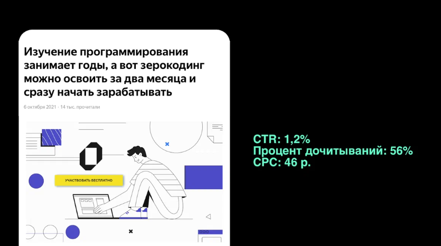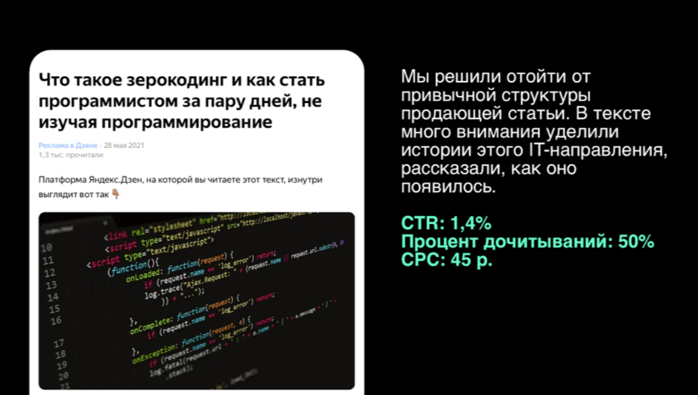 Статьи дочитывали до конца, но стоимость лида была запредельной. Сузив сюжет текста до конкретных людей, мы искусственно сузили средний уровень воронки: привлекательный заголовок давал хороший CTR, а само наполнение уже создавало впечатление, что зерокодинг подходит не всем.