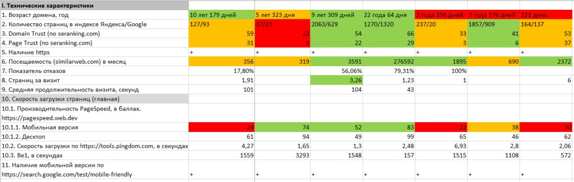возраст домена; количество страниц в индексе «Яндекса» и Google;