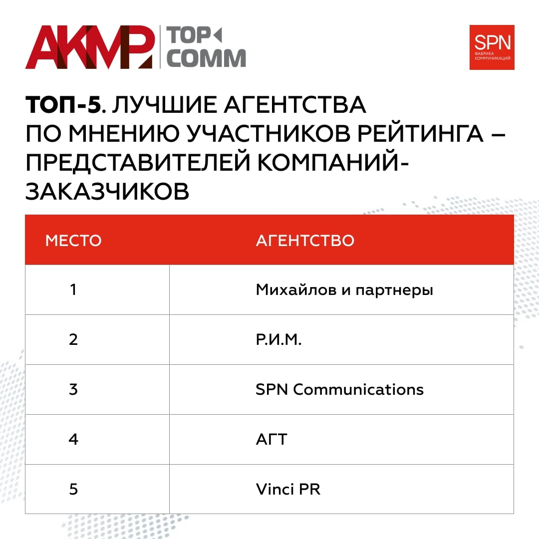 Коммуникационное агентство SPN Communications заняло третье место в списке лучших агентств России по мнению клиентов. Результаты итогов ХII Всероссийского рейтинга директоров и департаментов по корпоративным коммуникациям и корпоративным отношениям TOP-COMM объявила Ассоциация директоров по коммуникациям и корпоративным медиа России (АКМР).