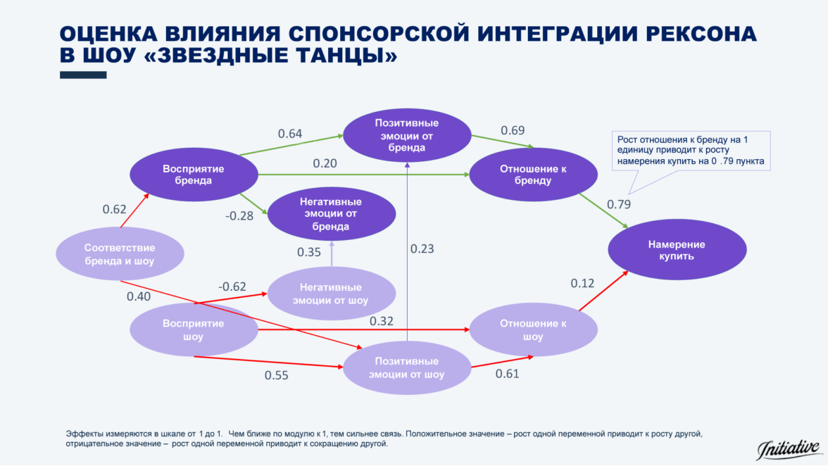 Рассчитывается, как изменения одного показателя влияют на другие. Для этого применяется математический метод частных наименьших квадратов, который позволяет точно определить силу и направление связей. Например, модель показывает, что улучшение отношения к шоу на один пункт приводит к росту позитивных эмоций к бренду на 0.4 п.п., а через них — к повышению вероятности покупки. Все связи выражаются в конкретных числовых значениях.