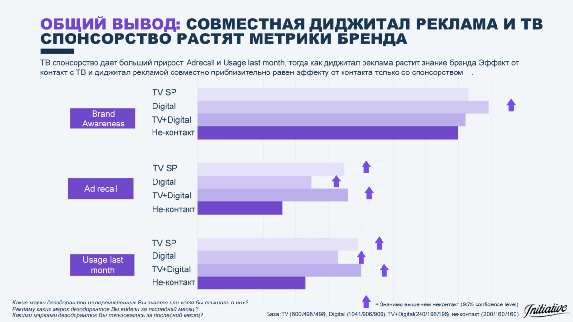 Одной из ключевых исследовательских задач было разделение эффекта от контакта аудитории с диджитальным и спонсорским размещением на ТВ. Отбор аудитории по прямому вопросу о факте контакта с рекламным креативом (клеймом), который все еще широко используется в индустрии для оценки эффективности ТВ-размещения, может существенно искажать получаемые данные. Часть опрашиваемой аудитории некорректно атрибутирует рекламу медиаканалам, часть успевает забыть креатив, и мы искусственно завышаем полученные цифры, отбирая в замер только тех, кто креатив вспомнил. Чтобы исключить эти факторы и получить максимально валидные данные, мы использовали выгрузки фактического контакта аудитории с креативами для обоих замеряемых медиаканалов.