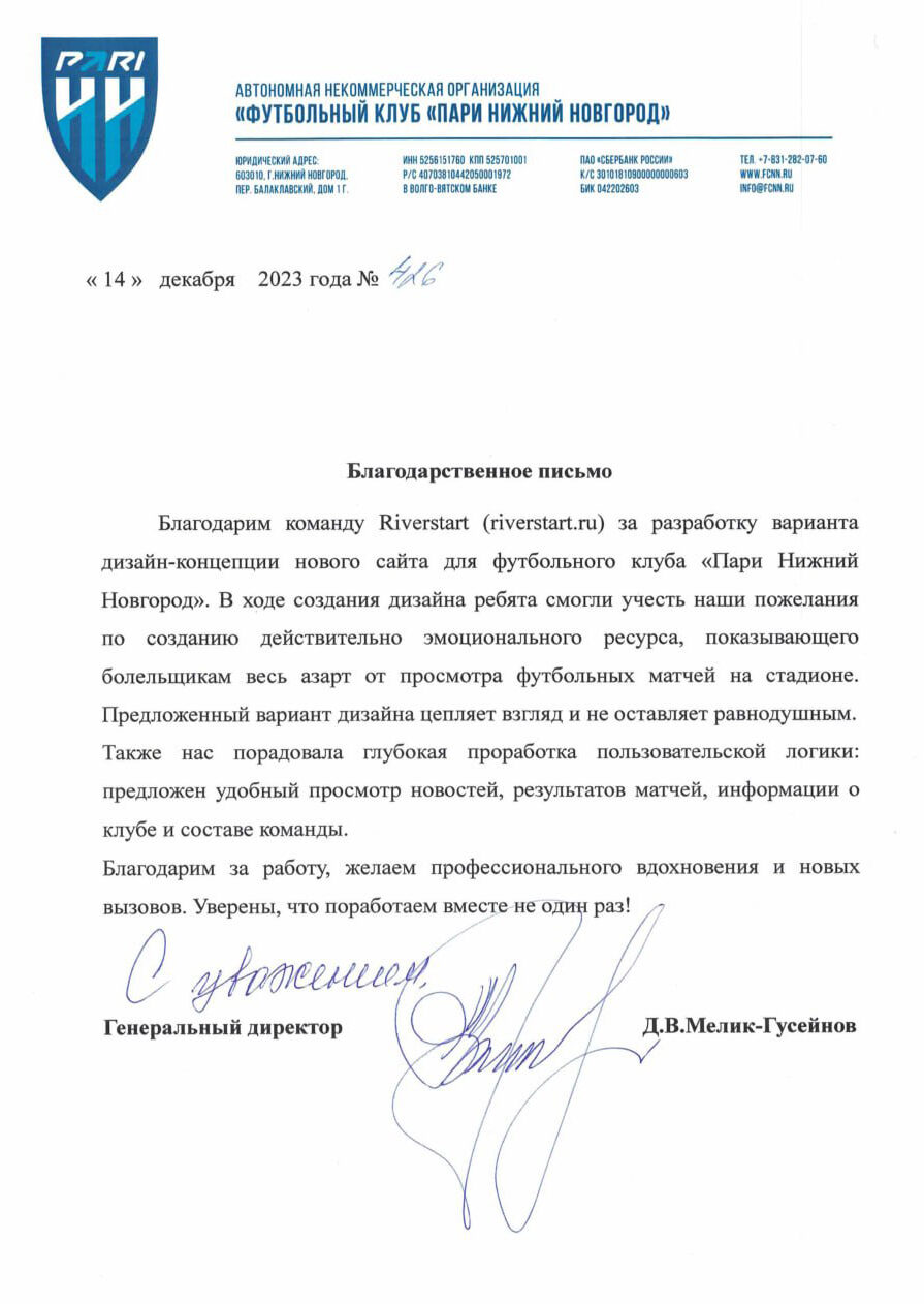 Обновлением сайта клуба «Пари-НН» занимается другая команда, но наша концепция сайта клубу очень понравилась: