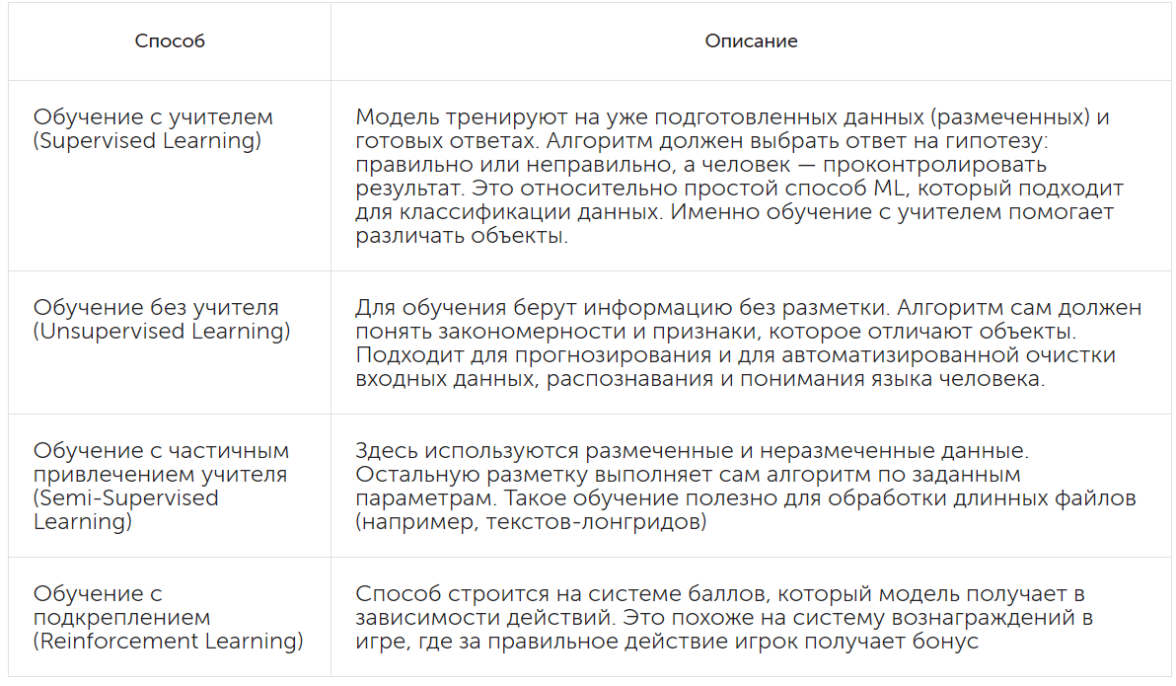 Способы ML классифицируются в зависимости от участия в нём человека. Существует машинное обучение с учителем, без учителя, с частичным привлечением учителя и с подкреплением.