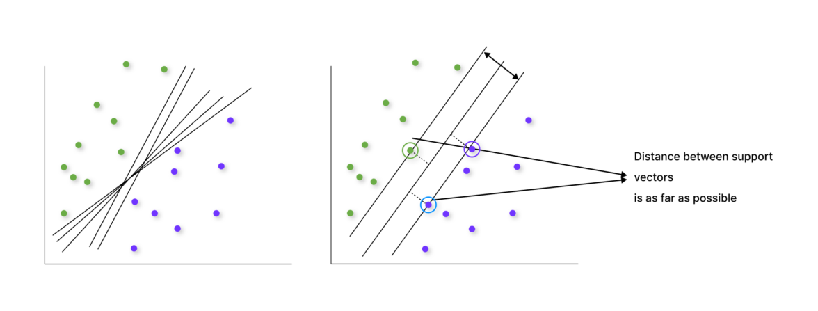 Включает несколько алгоритмов, которые классифицируют объекты в гиперплоскости, разделяемую векторами. И задача системы — найти наиболее правильное расположение линии в плоскости для лучшей классификации.