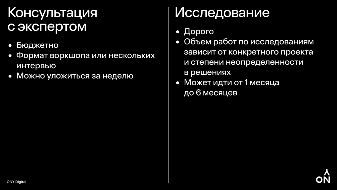 Недостаток знаний в какой-то области — это нормально. В таких ситуациях можно обратиться за советом к экспертам, например, к продакт-менеджерам с опытом запуска крупных проектов. Если нужно глубокое понимание, например, вашей аудитории, лучше провести исследование перед началом разработки. Исследования дают комплексные данные, но занимают больше времени и стоят дороже. Другой вариант — точечные консультации: они позволяют сэкономить время и средства. Выбор зависит от задач и ресурсов, но оба подхода помогают снизить риски и уверенно двигаться к цели.