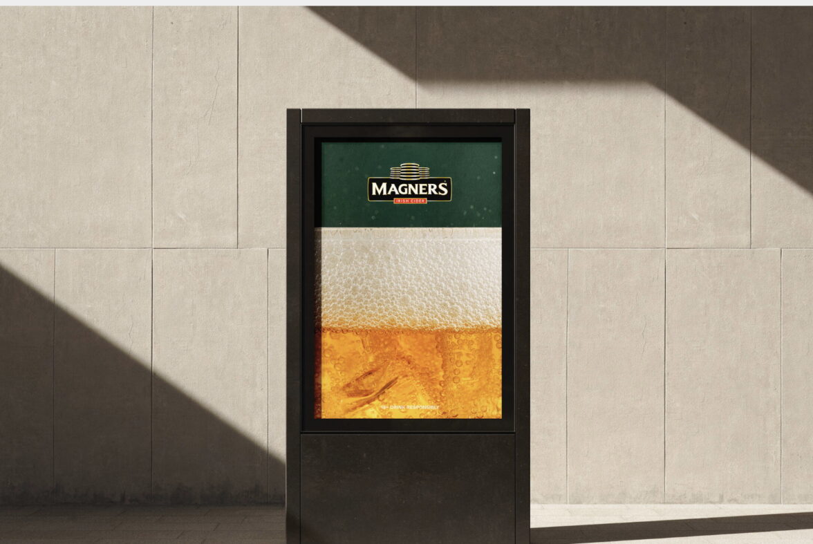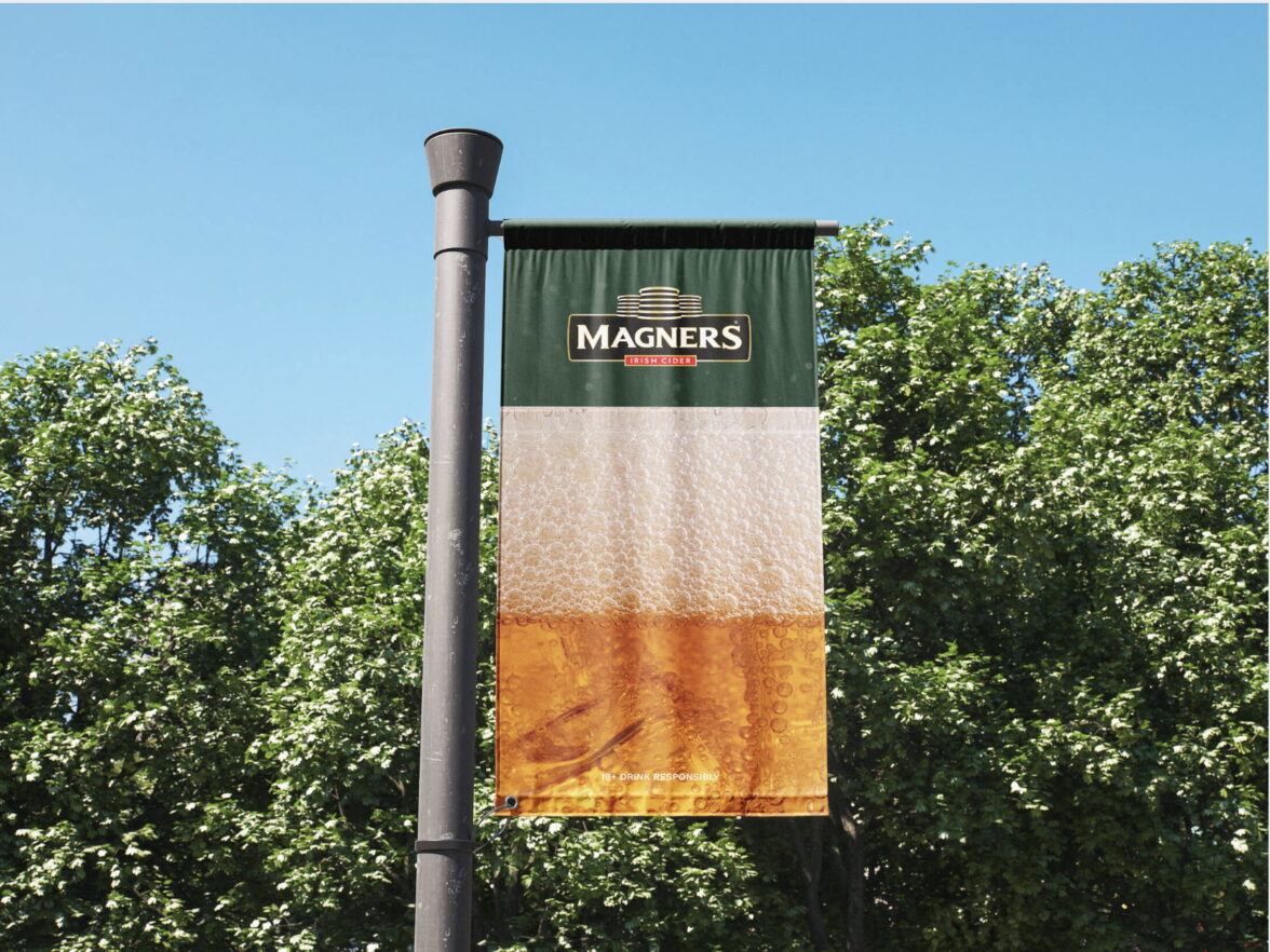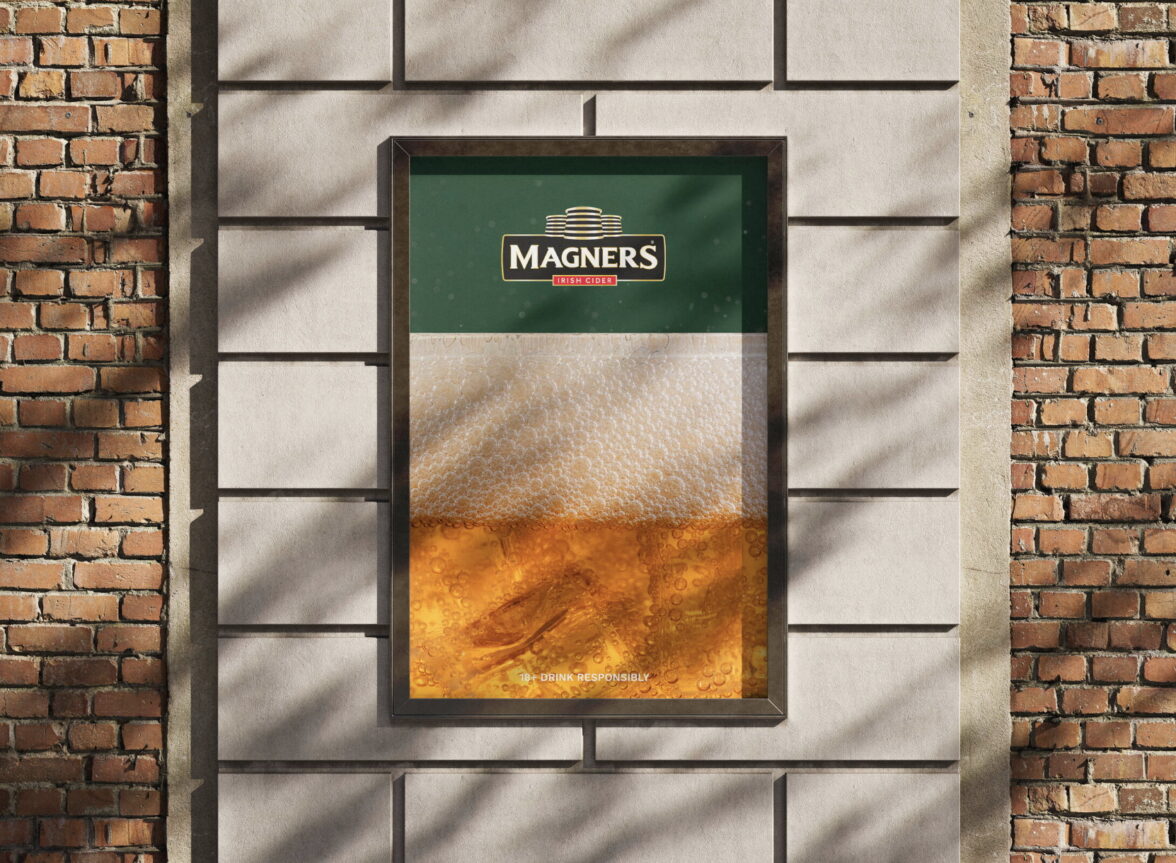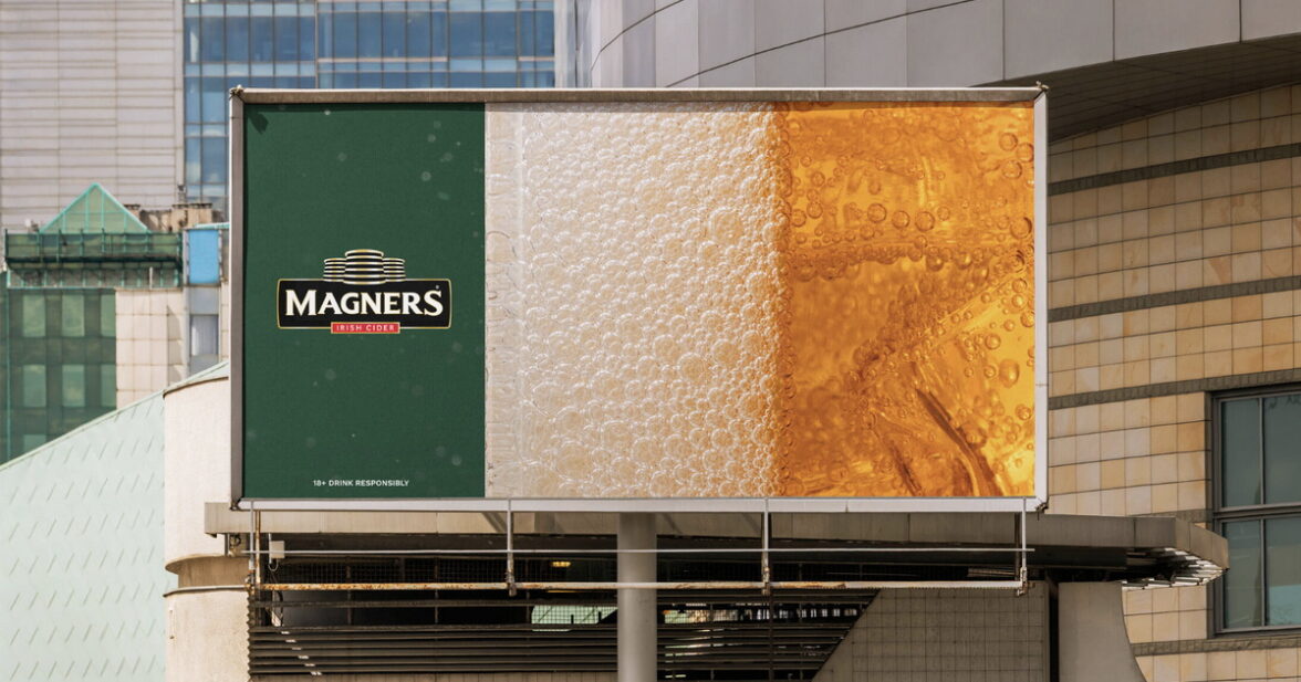 Рекламную кампанию для бренда Magners разработало агентство Good Drinks Australia. Она включает в себя 5 рекламных элементов OOH и DOOH. Три цвета ирландского флага — оранжевый, белый и зеленый — переданы с помощью макрофотографии сидра на льду. Оранжевый — свеженалитый сидр Magners Irish Cider, белый — пена, а вот зеленый, правда, просто добавлен. На зеленом фоне размещен логотип бренда.