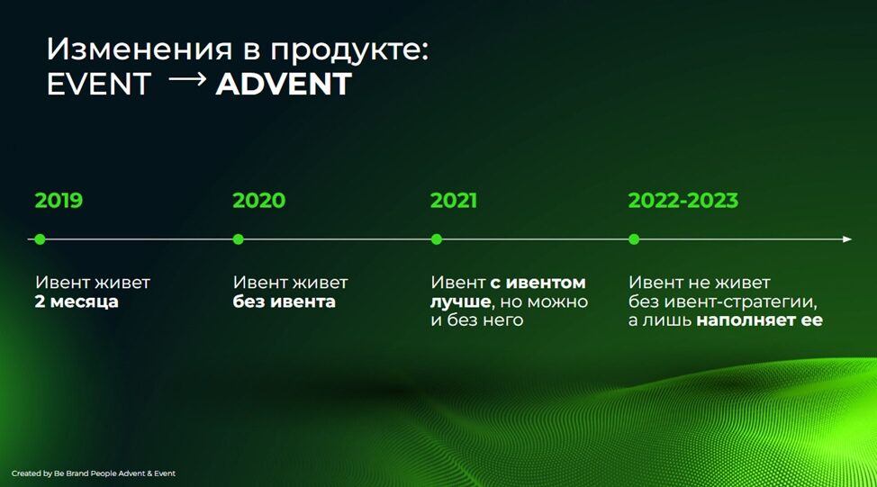 Изменился не только рынок, но и сам продукт. Если раньше ивент жил около двух месяцев, что включало в себя подготовку к мероприятию и его реализацию, то за последние несколько лет он трансформировался в новое явление — Advent.