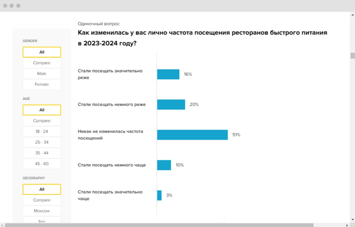Мы опросили мужчин и женщин в возрасте от 18 до 60 лет, проживающих в городах России с населением более 100 тысяч человек. Выяснилось, что более чем три четверти аудитории посещают рестораны быстрого питания не реже раза в месяц — этот показатель значительно не изменился по сравнению с 2023 г. При этом женщины стали ходить в рестораны быстрого питания реже (44%), чем мужчины (28%).