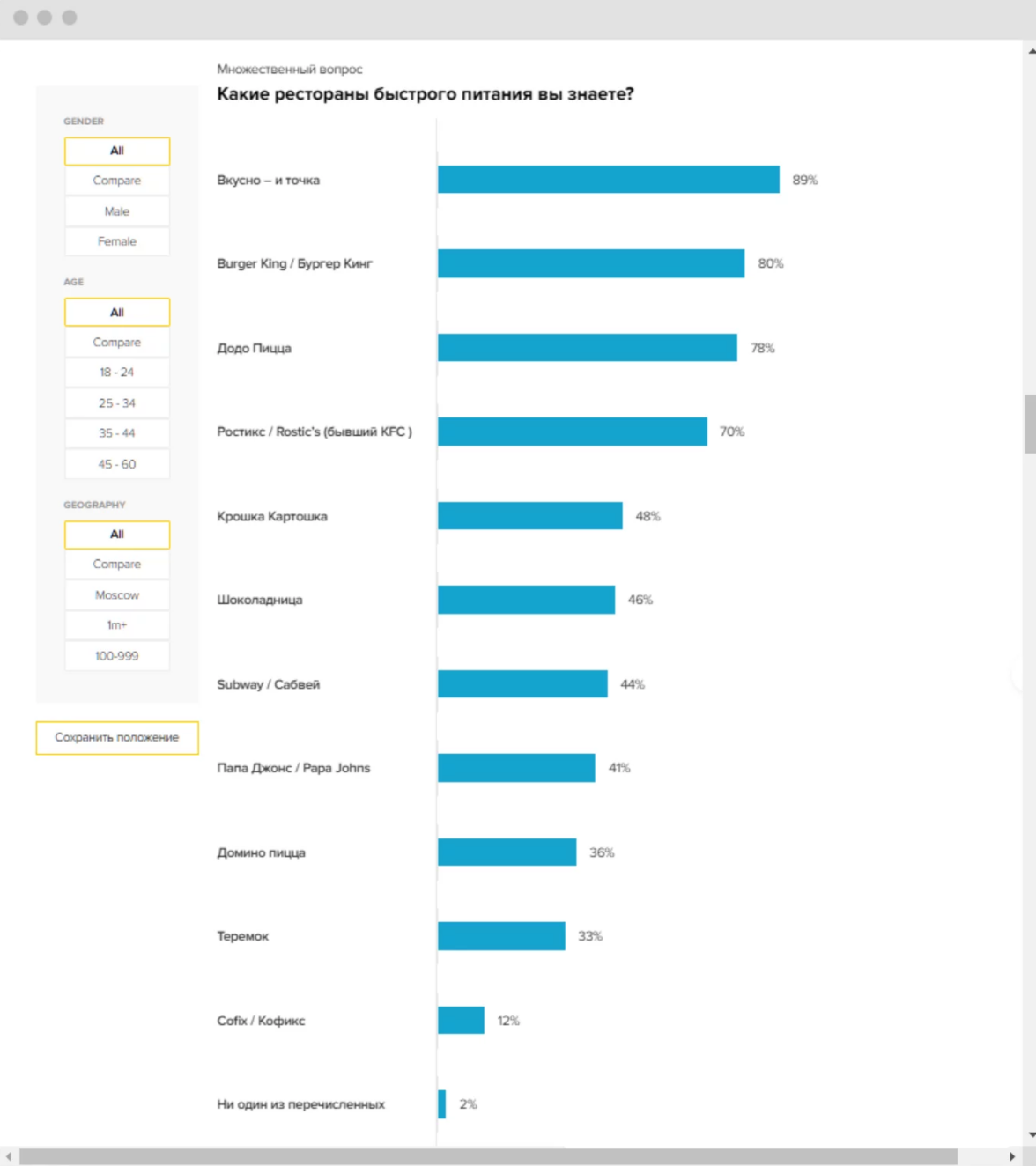 Самый известный и наиболее часто посещаемый ресторан быстрого питания — «Вкусно — и точка» (89% респондентов знают, 59% посещали за 3 месяца). Треть аудитории называет сеть своим любимым рестораном быстрого питания. В топ-4 по узнаваемости входят также «Бургер Кинг», «Додо Пицца» и ROSTIC’S (бывший KFC).
