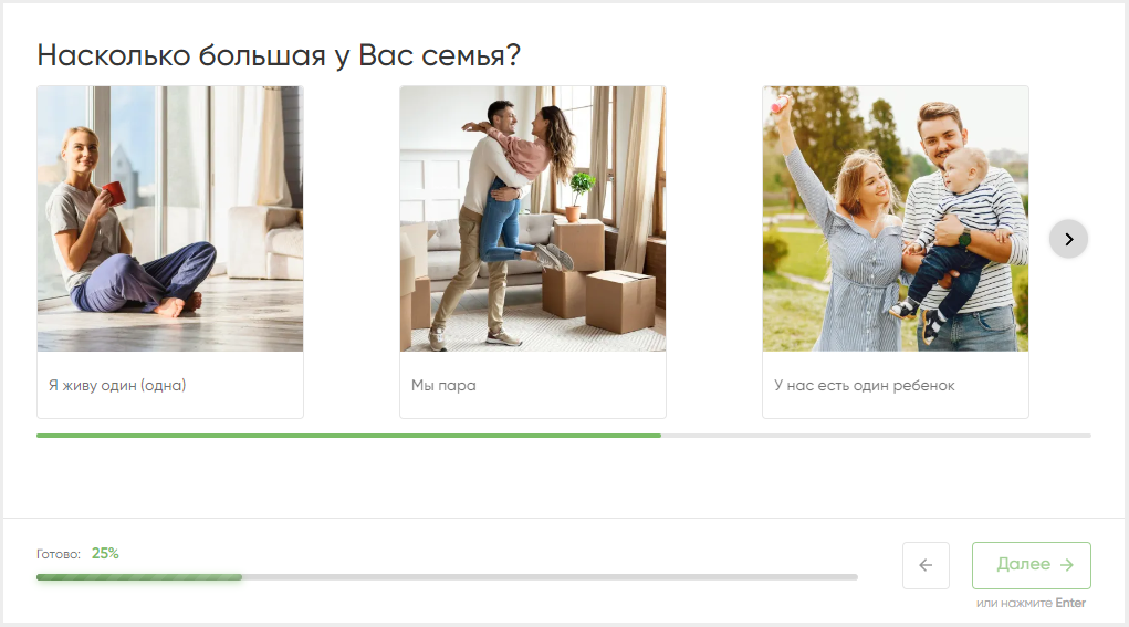 Формат хорош тем, что полностью вовлекает человека: у пользователя, который перешел в квиз, нет возможности быстро проскроллить ленту. Сама механика раззадоривает ответить на все вопросы до конца, а визуализация вопросов помогает помечтать об идеальной квартире. О твоей идеальной квартире — персонализация очень важна. Кроме того, важен психологический фактор: оставить заявку в квизе обычно проще, чем позвонить самому.