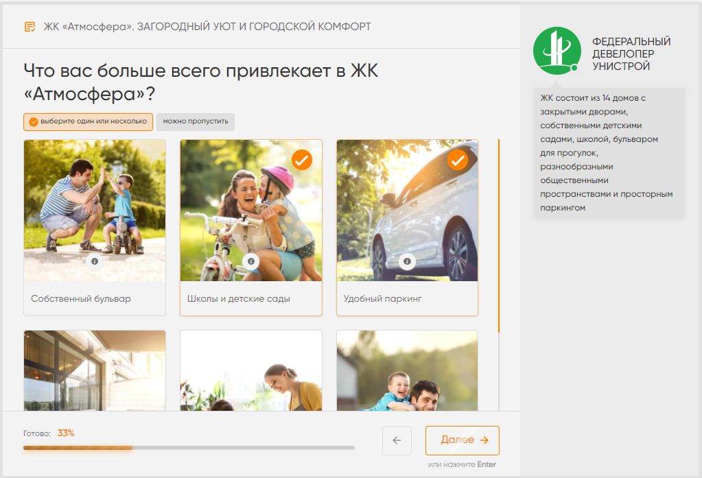 Мы используем квизы, когда продвигаем новые жилые комплексы, в которых доступно много квартир для покупки, и подобрать нужную жилплощадь можно по разным параметрам (этажность, количество комнат и другие).