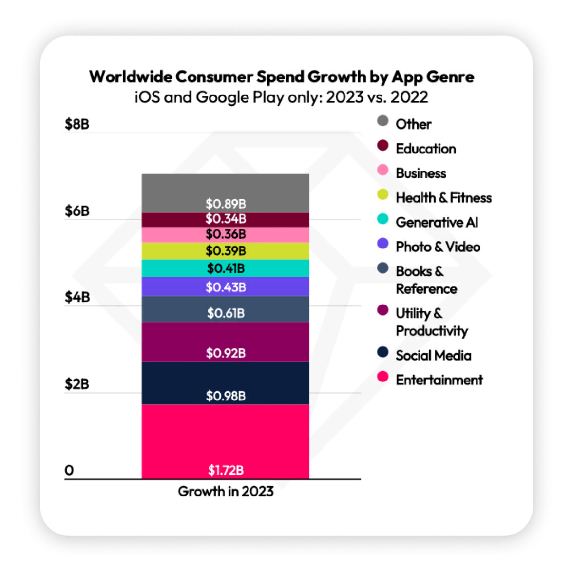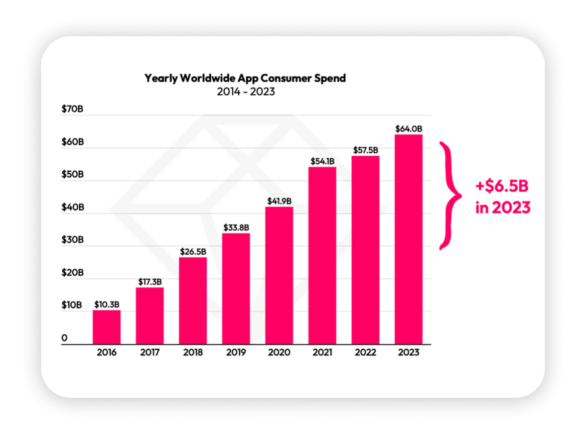 Более того, расходы потребителей в различных категориях приложений, таких как развлечения, социальные медиа и утилиты, растут с каждым годом.