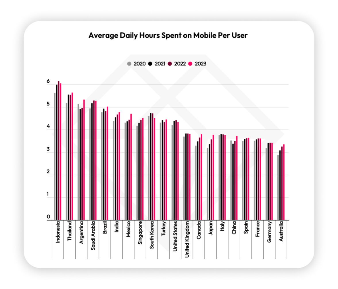 Например, в Индонезии люди используют свои мобильные устройства более 6 часов в день. Еще четыре страны, такие как Таиланд, Аргентина, Саудовская Аравия и Бразилия, использовали мобильные приложения более 5 часов ежедневно.