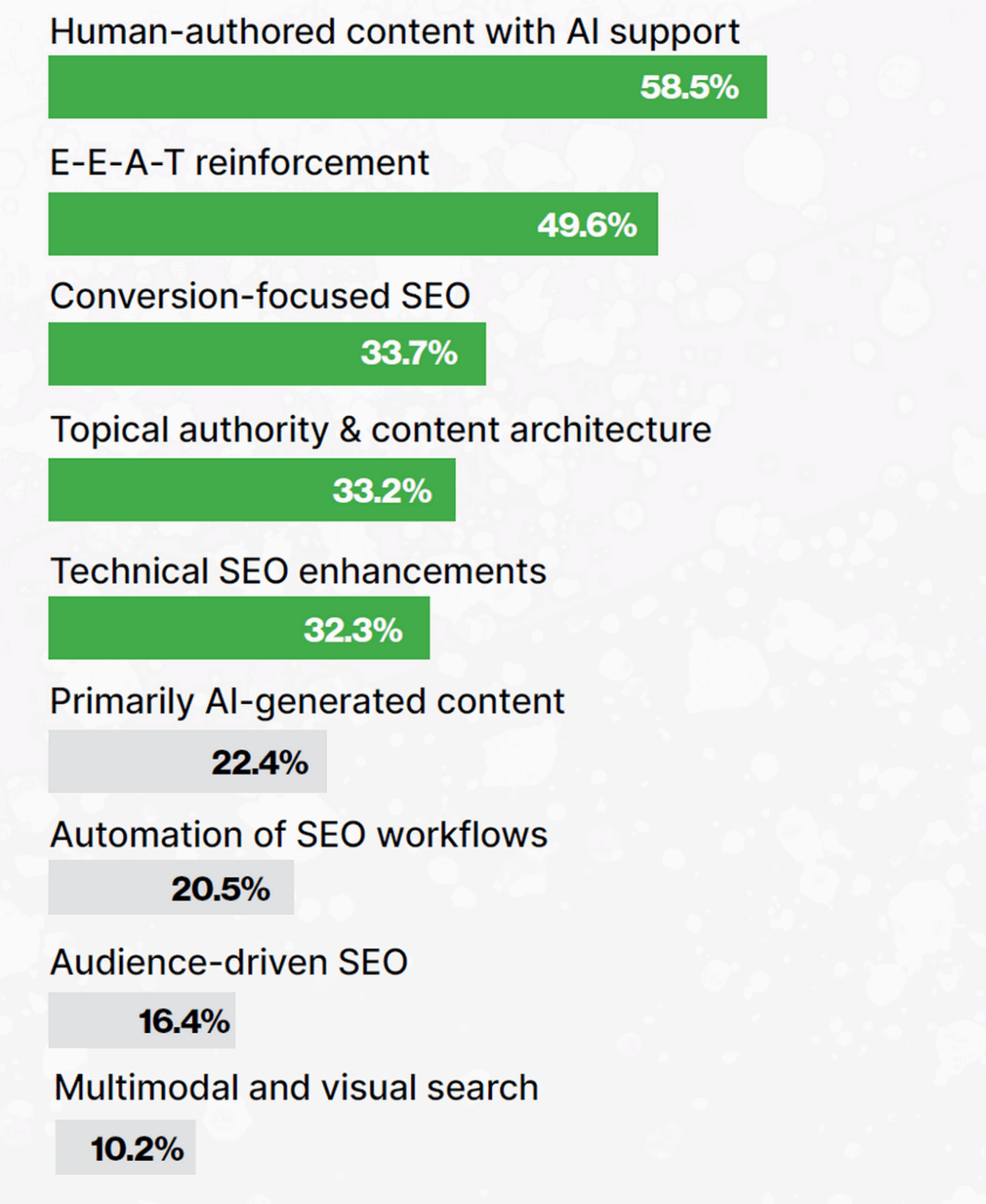 Приоритеты развития SEO: Контент, написанный людьми с поддержкой AI — 58,5%; усиление E-E-A-T — 49,6%; SEO, ориентированное на конверсии — 33,7%; развитие тематического авторитета и архитектуры контента — 33,2%; технические улучшения SEO — 32,3%; преимущественно ИИ-сгенерированный контент — 22,4%; автоматизация SEO-процессов — 20,5%; SEO, ориентированное на аудиторию — 16,4%; мультимодальный и визуальный поиск — 10,2%.
