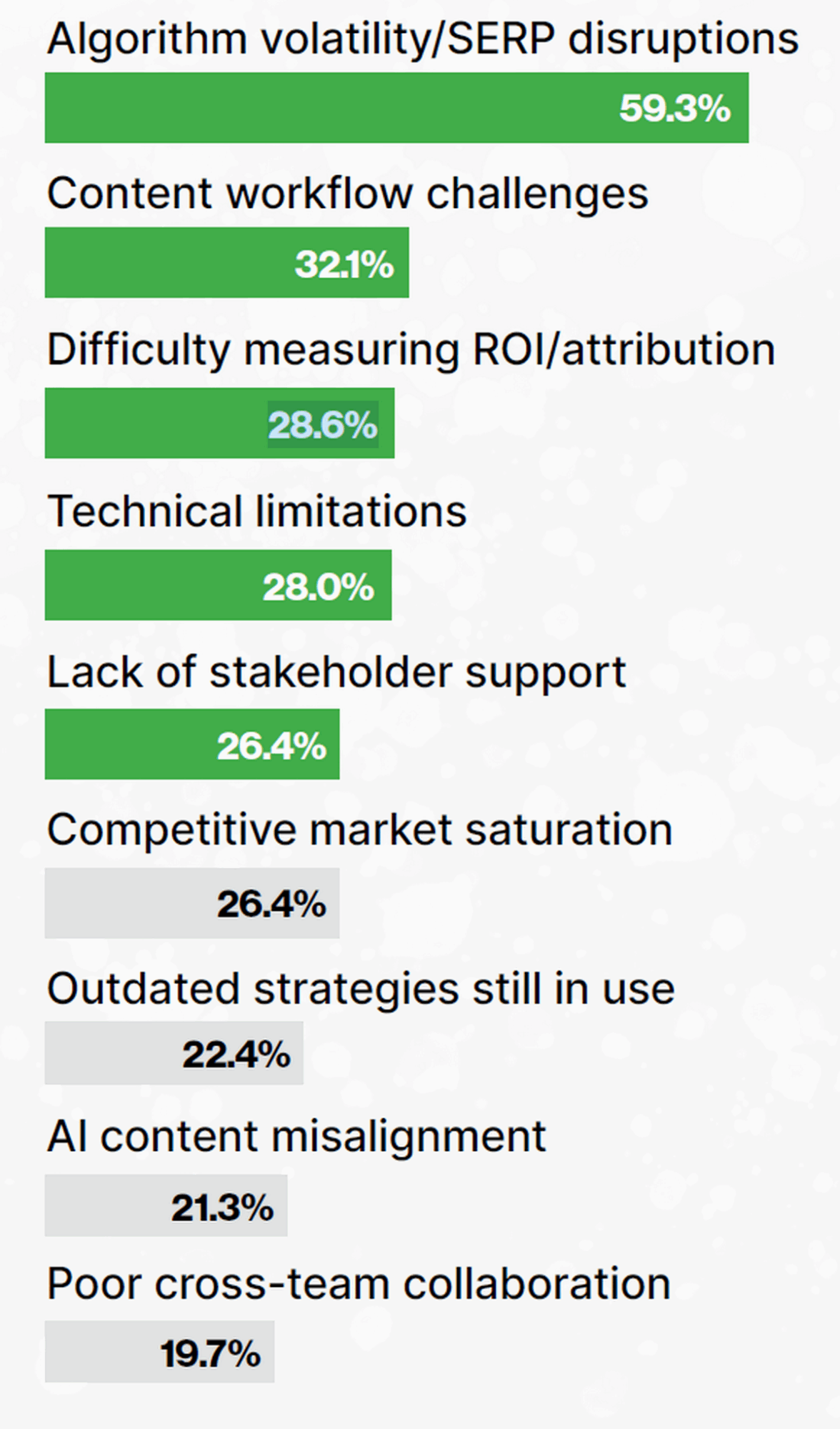 Основные сложности SEO: Нестабильность алгоритмов и сбои в поисковой выдаче — 59,3%; сложности с рабочими процессами контента — 32,1%; трудности измерения ROI и атрибуции — 28,6%; технические ограничения — 28,0%; недостаток поддержки со стороны стейкхолдеров — 26,4%; перенасыщение рынка и конкуренция — 26,4%; устаревшие стратегии — 22,4%; несоответствие AI-контента — 21,3%; слабое взаимодействие между командами — 19,7%.