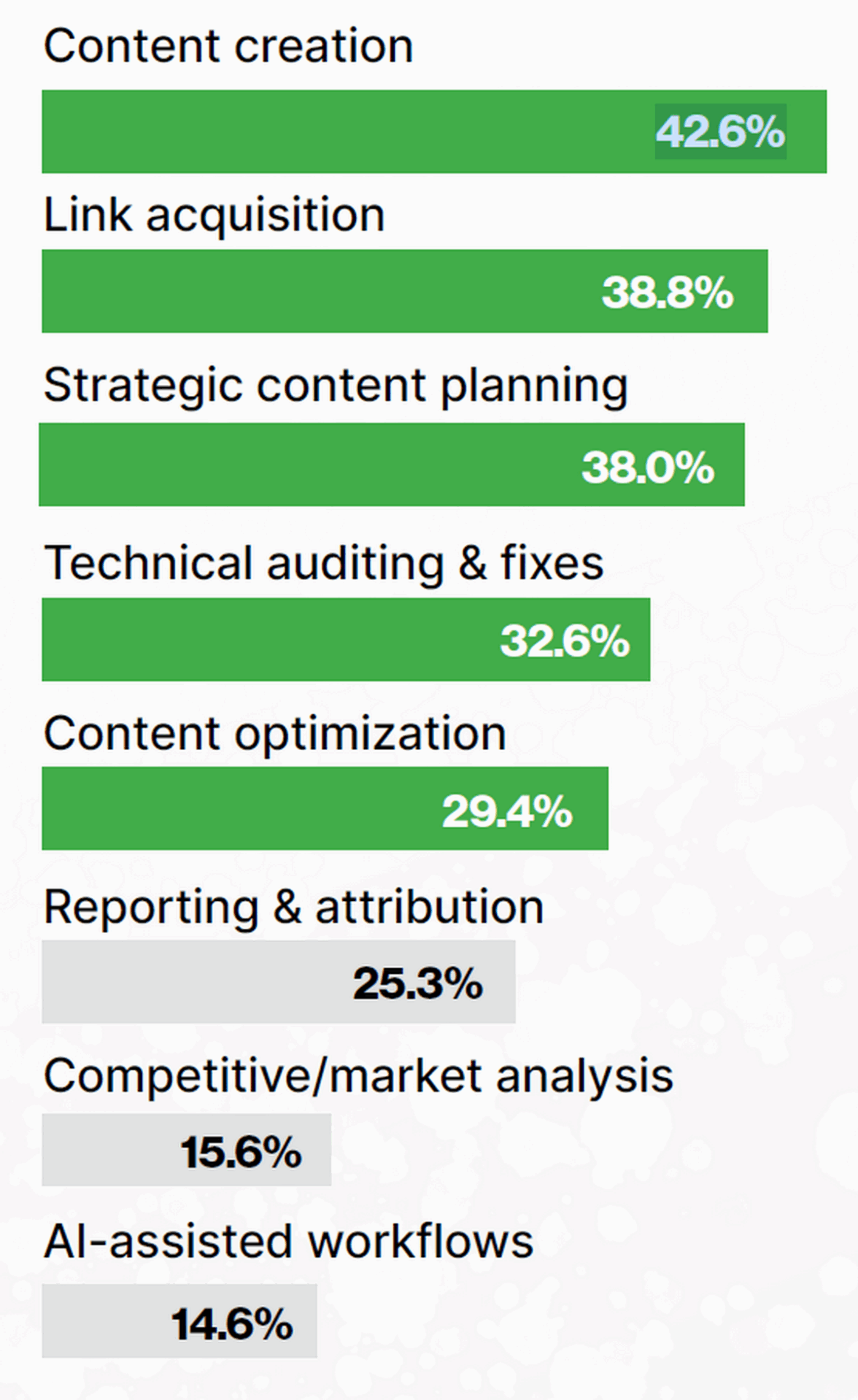 Наиболее ресурсоемкие задачи: Создание контента — 42,6%; получение ссылок — 38,8%; стратегическое планирование контента — 38,0%; технический аудит и исправления — 32,6%; оптимизация контента — 29,4%; отчетность и атрибуция — 25,3%; конкурентный и рыночный анализ — 15,6%; AI-ассистированные рабочие процессы — 14,6%.