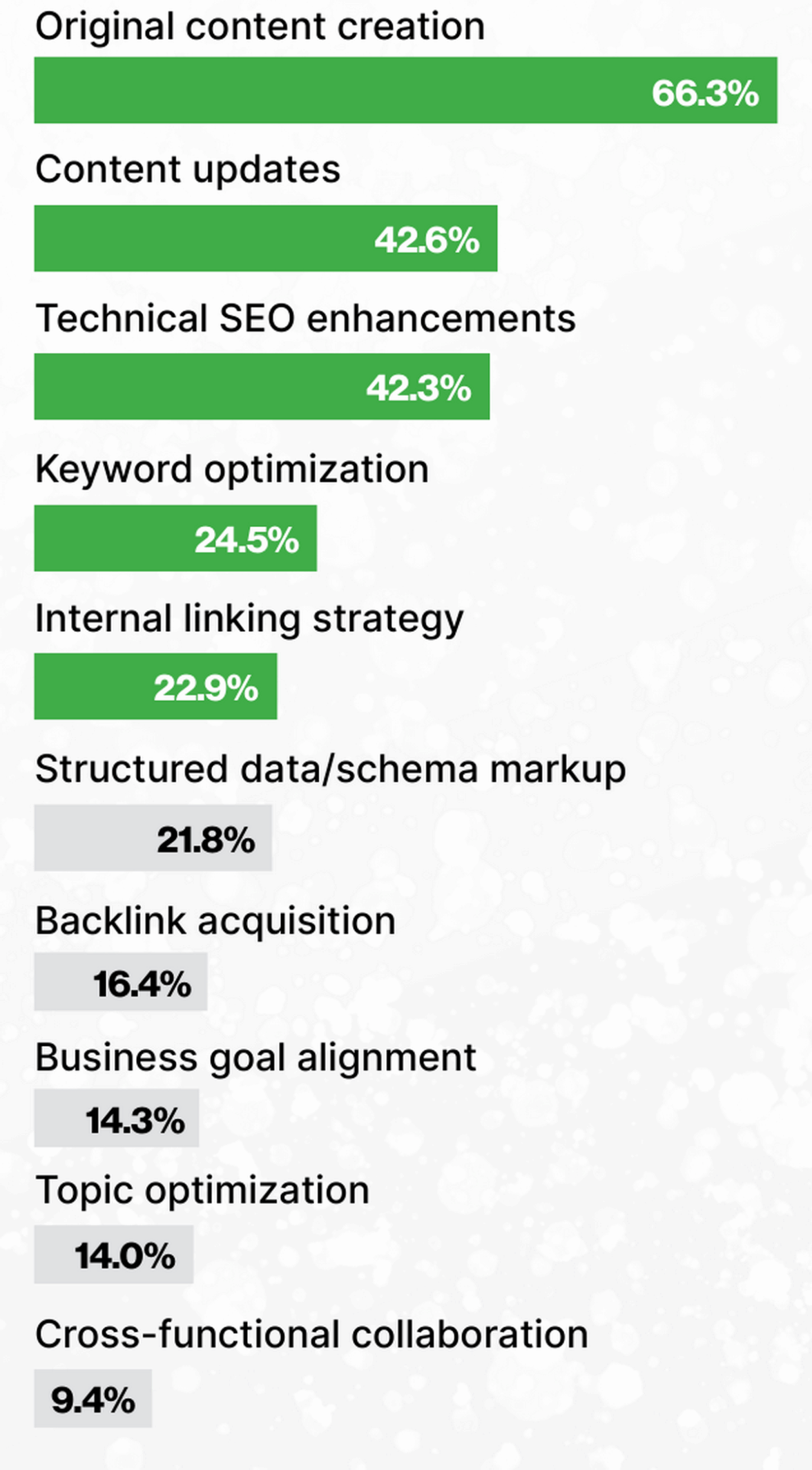 Ключевые факторы успеха в SEO: Создание оригинального контента — 66,3%; обновление контента — 42,6%; технические улучшения SEO — 42,3%; оптимизация ключевых слов — 24,5%; внутренняя перелинковка — 22,9%; структурированные данные/Schema markup — 21,8%; ссылочное продвижение — 16,4%; соответствие бизнес-целям — 14,3%; тематическая оптимизация — 14,0%; кросс-функциональное взаимодействие — 9,4%.