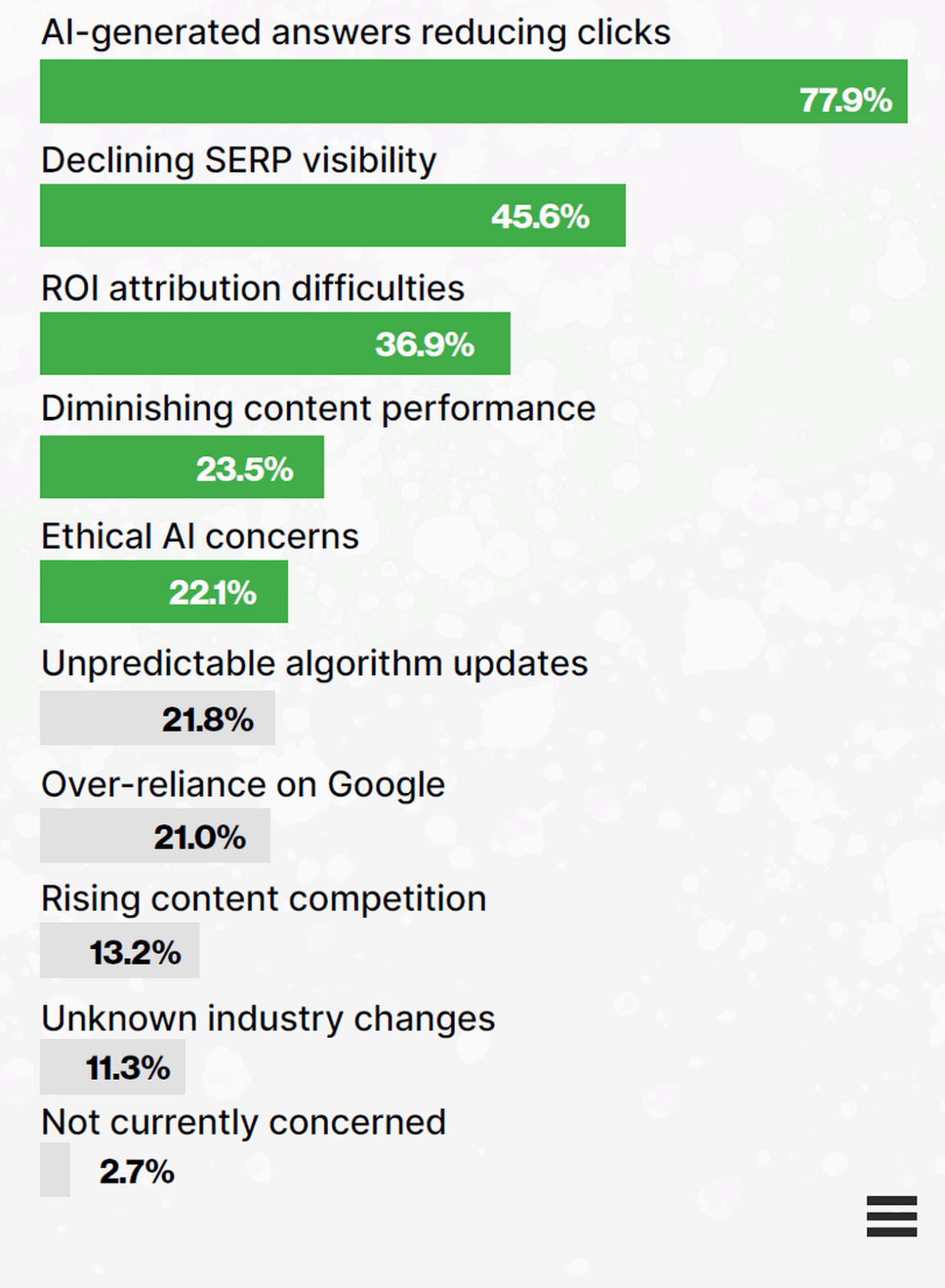 Главные угрозы для отрасли: AI-ответы, уменьшающие клики — 77,9%; снижение видимости в поисковой выдаче — 45,6%; сложности с атрибуцией ROI — 36,9%; падение эффективности контента — 23,5%; этические вопросы использования AI — 22,1%; непредсказуемые обновления алгоритмов — 21,8%; чрезмерная зависимость от Google — 21,0%; рост конкуренции в контенте — 13,2%; неизвестные изменения в индустрии — 11,3%; отсутствие текущих опасений — 2,7%.