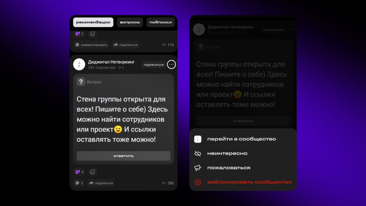 Иногда в разговоре хочется уйти от тем, которые нам не интересны. В Сетке это стало возможно: чтобы избавить вас от нерелевантного контента, мы добавили кнопку «не интересно». Теперь легко убрать из ленты посты и авторов, которые вам не подходят.