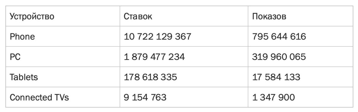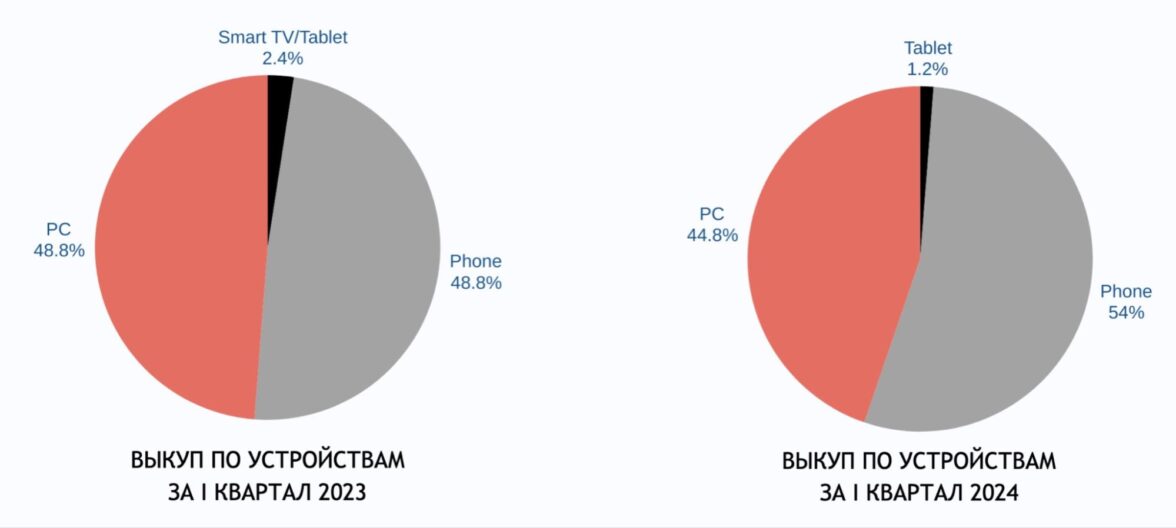 Выкуп по устройствам держится на уровне соотношения 50/50 между ПК и смартфонами. Но если посмотреть на показатели прошлого года, можно увидеть что доля Phone все-таки подросла. Рост пока незначительный (5,2%), но тенденцию зафиксировать можно.